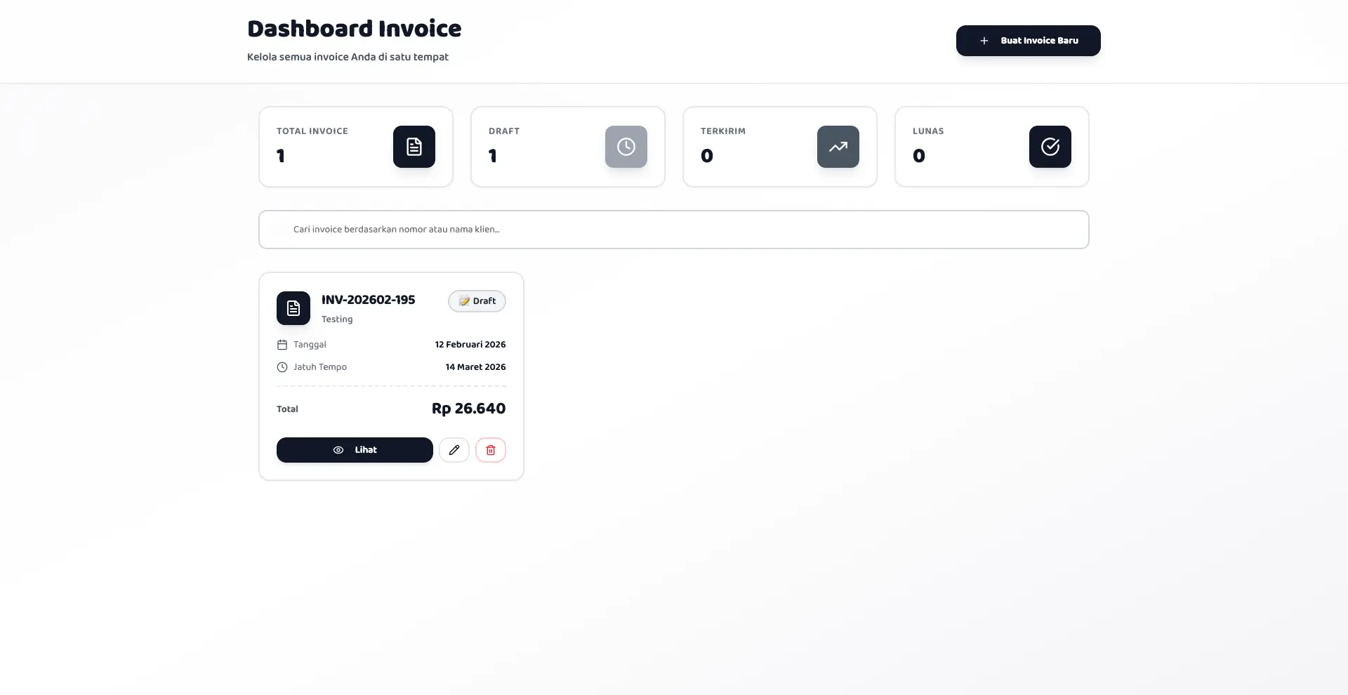 Cari invoice berdasarkan nomor invoice atau nama klien dengan fitur pencarian real-time. Kelola puluhan bahkan ratusan invoice dengan mudah melalui interface yang terorganisir.