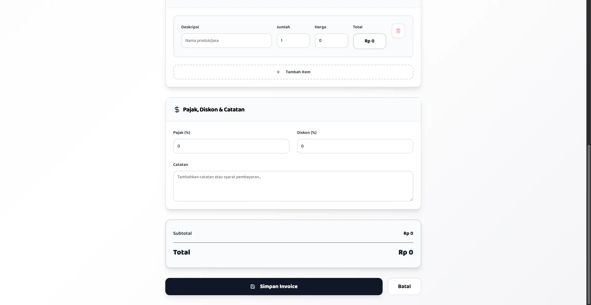 CRUD (Create, Read, Update, Delete) invoice dengan interface yang intuitif. Tambahkan detail klien, item produk/jasa, pajak, diskon, dan catatan dengan mudah melalui form yang user-friendly.
