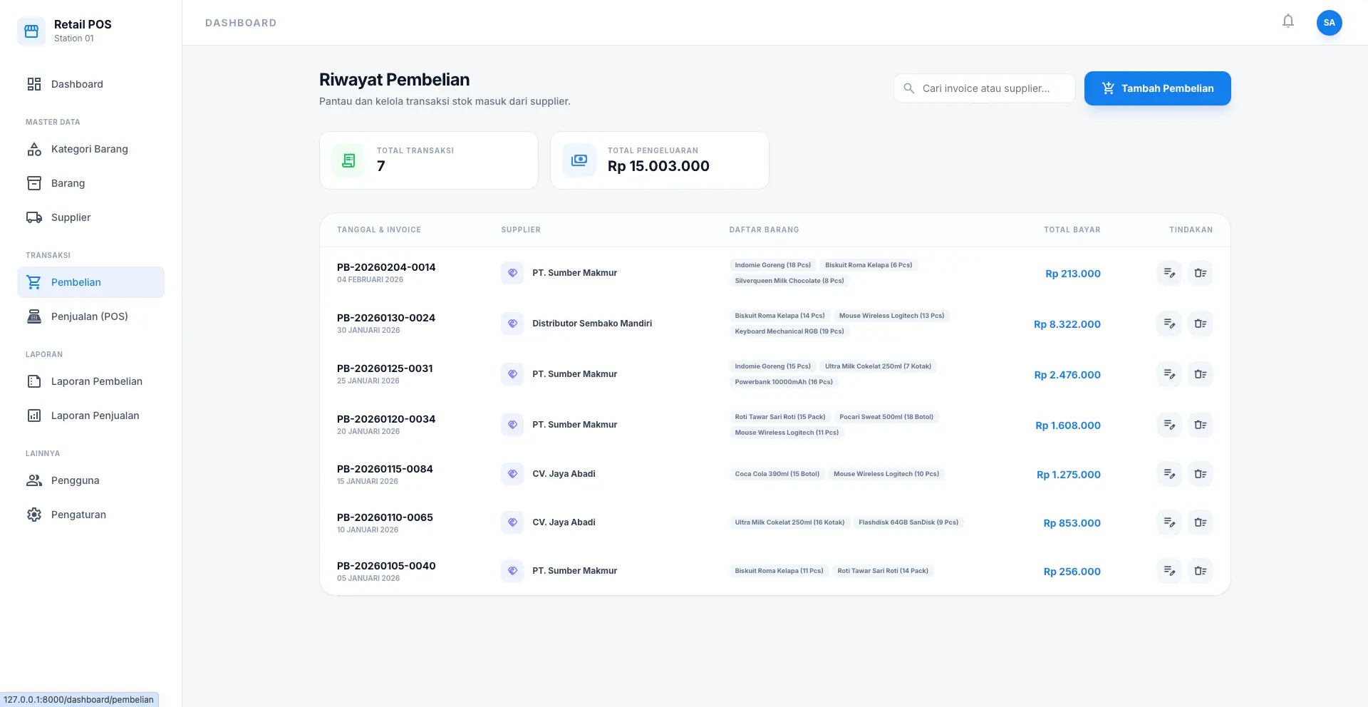 - MySQL: Database handal untuk menyimpan data produk, transaksi, supplier, dan pengguna secara aman.