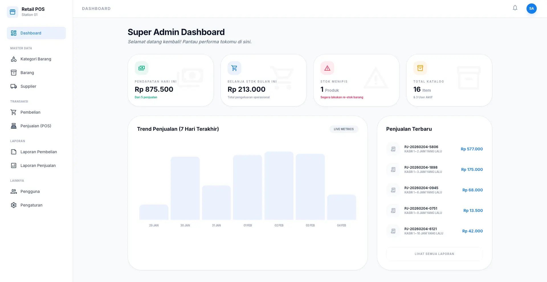 - Memudahkan pengambilan keputusan bisnis berdasarkan tren penjualan 7 hari terakhir di dashboard.