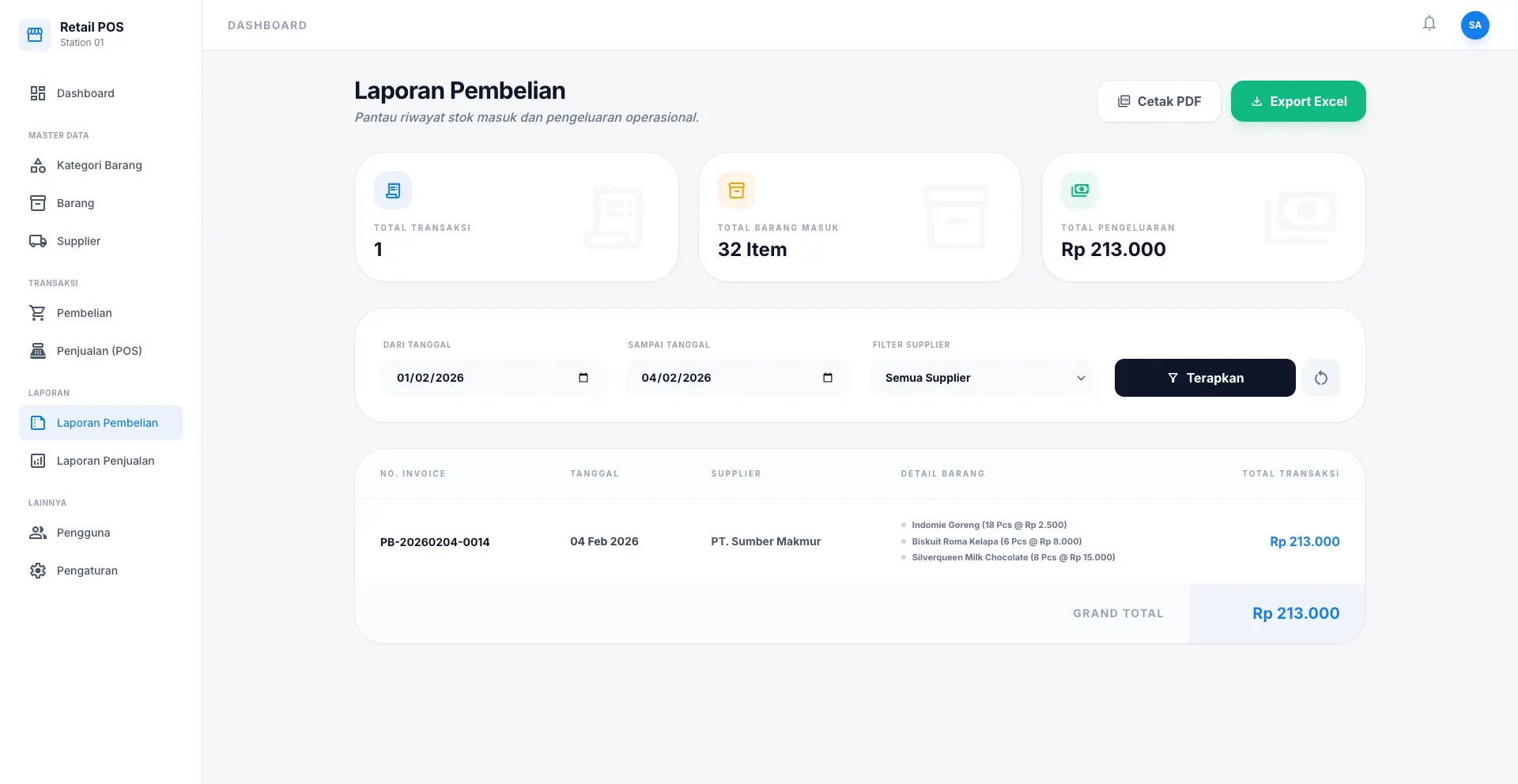 Halaman kasir reaktif dengan Alpine.js untuk input cepat. Laporan penjualan dan pembelian dapat diekspor secara instan ke format Excel dan PDF yang rapi, lengkap dengan filter rentang waktu presisi.