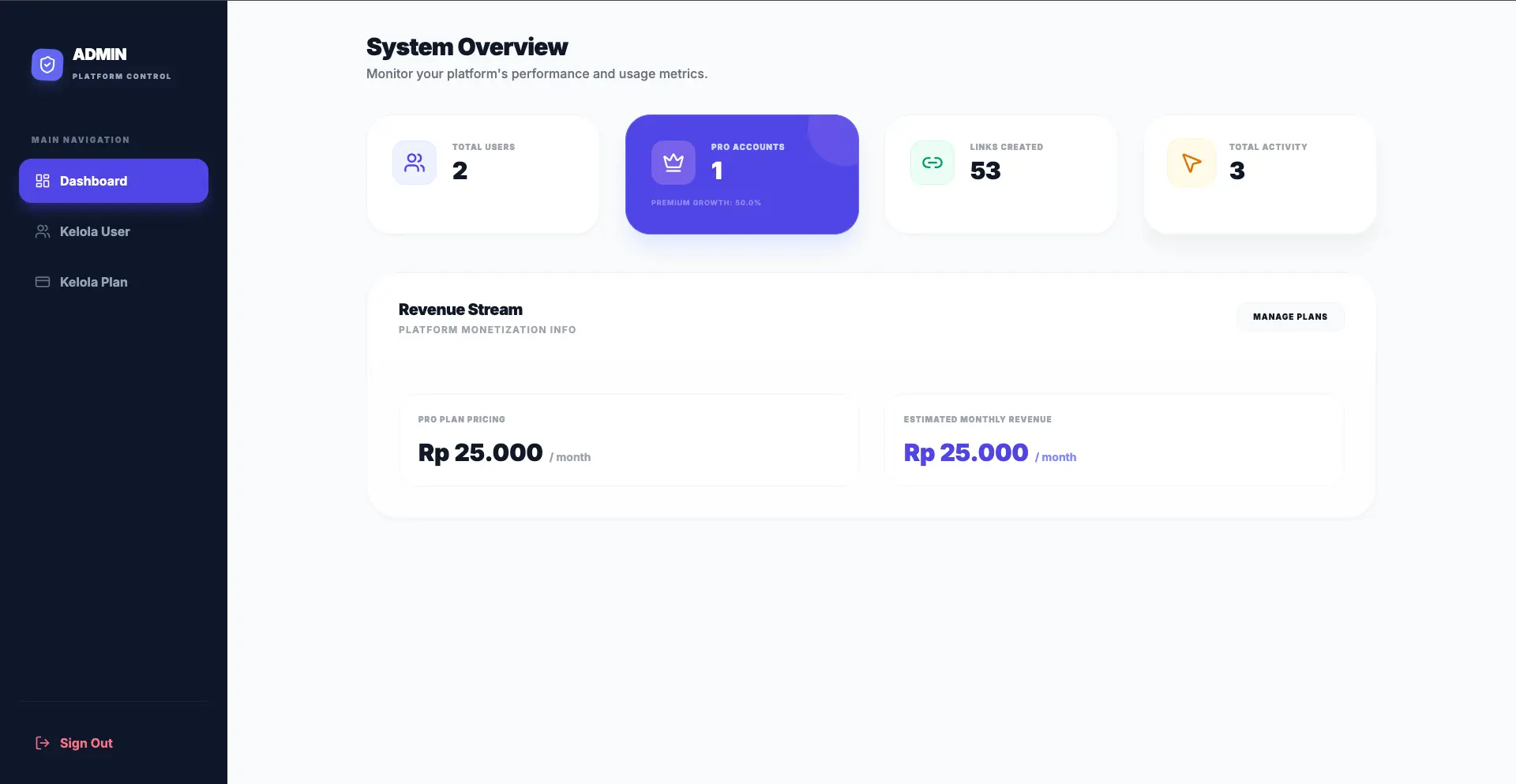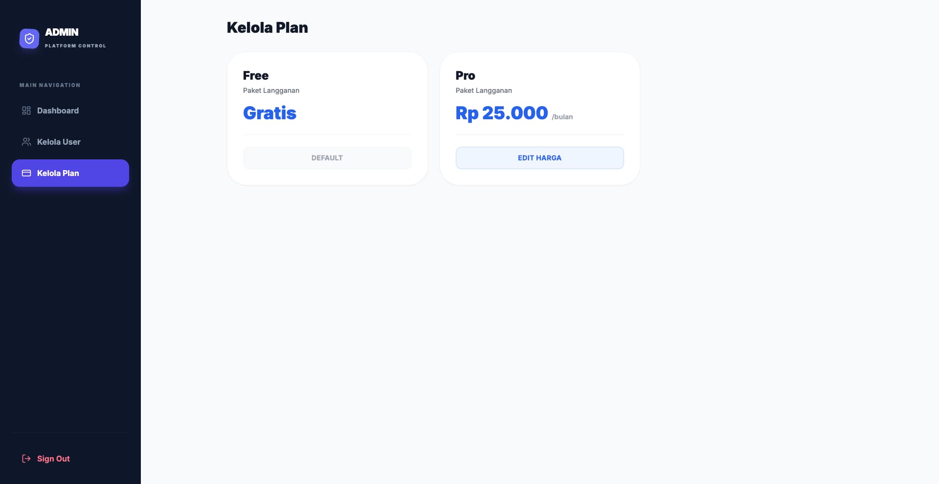 Dashboard Admin - Kelola Plan