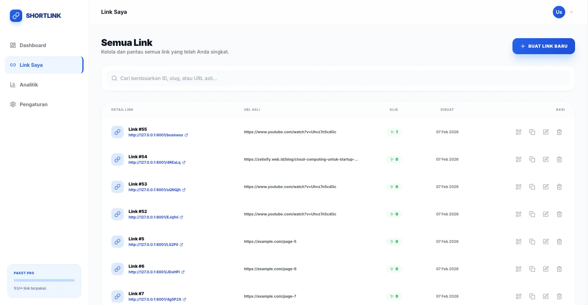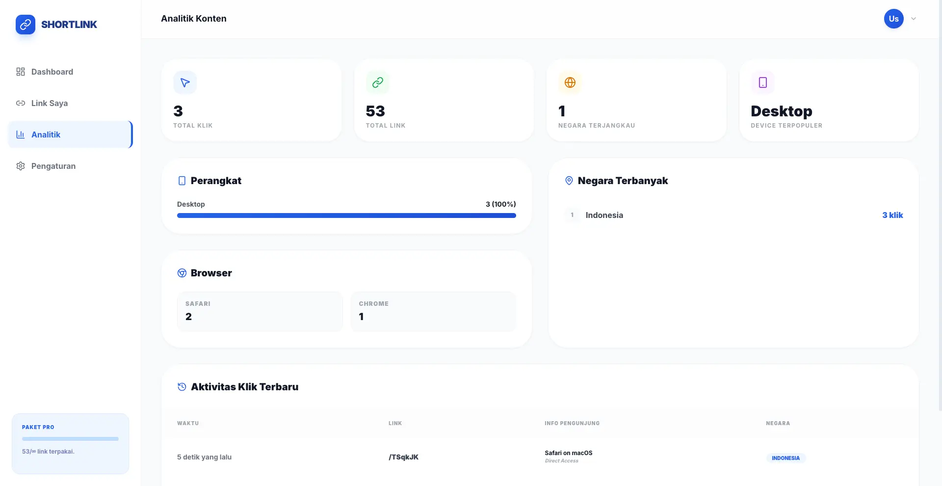Halaman statistik yang informatif untuk memantau performa link secara keseluruhan, termasuk total klik, penggunaan kuota paket, dan ringkasan aktivitas terbaru.